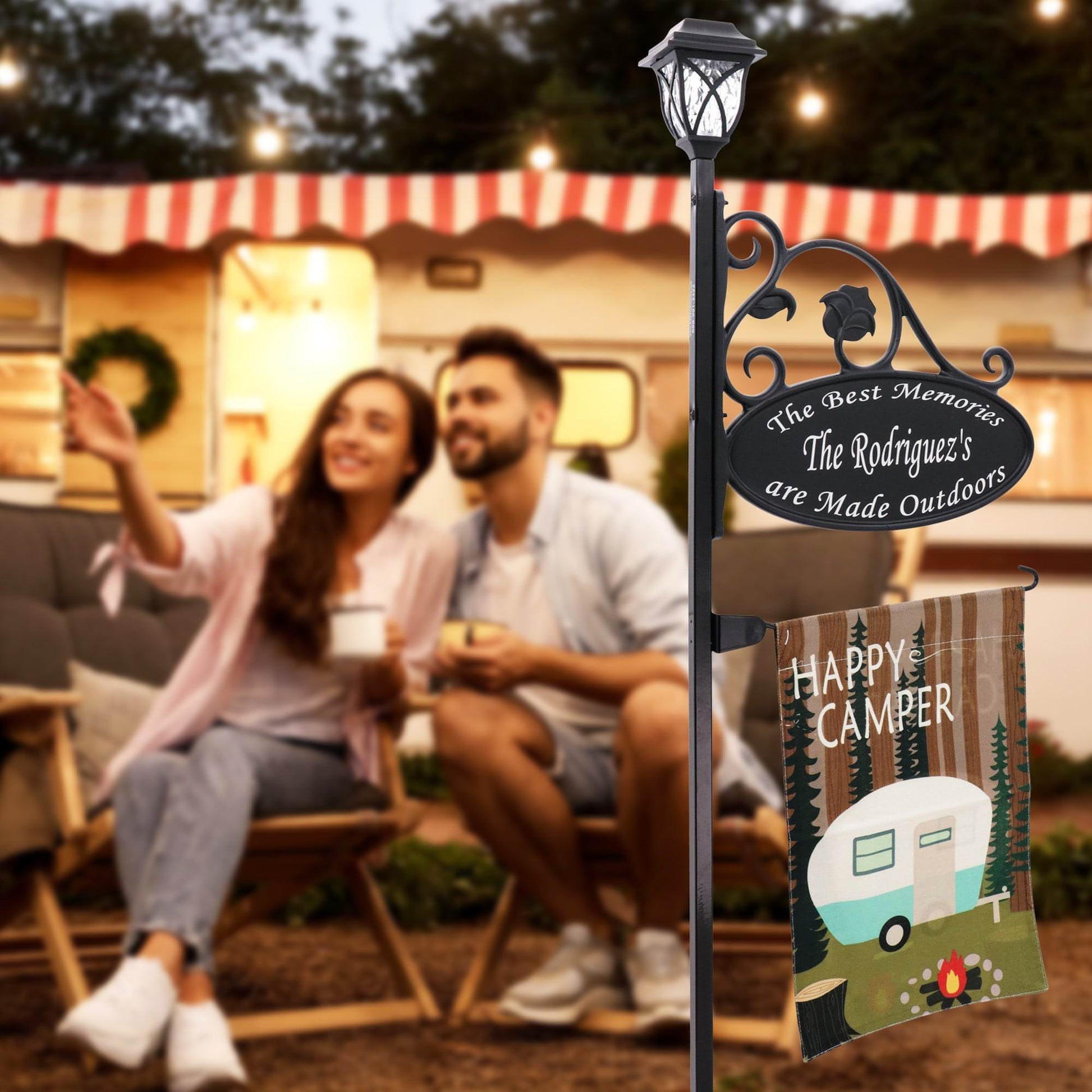 Address America Camping RV Parks Sign Double Sided Reflective Sign with Flag and Solar Light - Great Gift (Happy Camper Flag)
