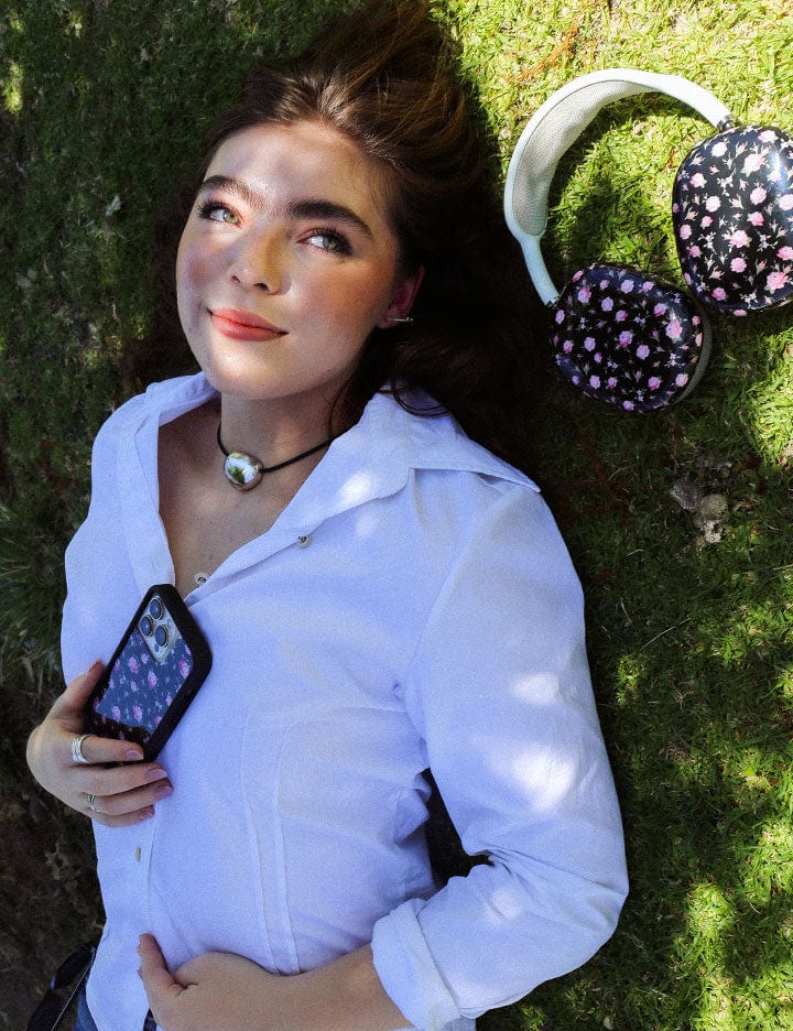 Meet our Black and Pink Floral iPhone case — a moody dainty floral reminiscent of Betsey Johnson’s prints in the 90s. Pink mini rose buds and dainty roses cover this all black case. For a matchy moment, complement your case with our Black and Pink Floral Airpods Max and Pro cases.