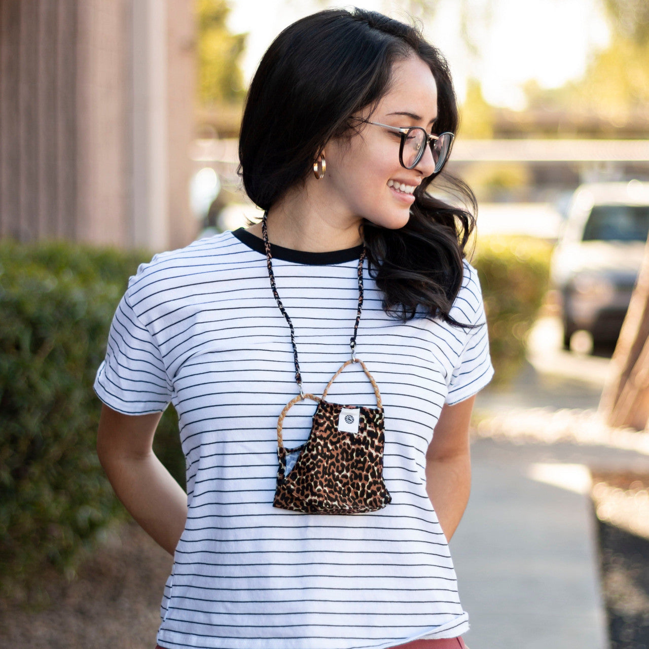 Black Leopard Face Mask Holder | Woven Neck Lanyard with Clips