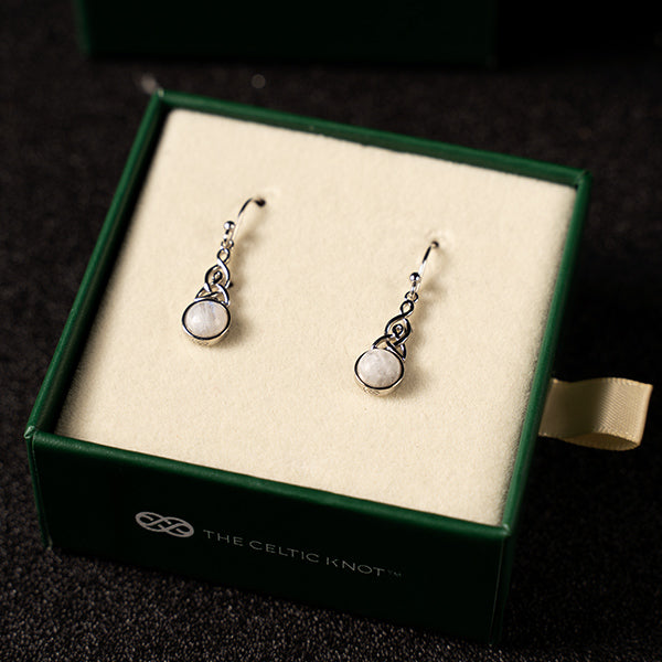 Each earring features a delicate Celtic Mother knot – a tiny emblem of mother and child side by side – dangling just below the ear. This intricate pattern captures the very essence of motherhood, symbolizing a nurturing, protective love that knows no bounds. As the natural moonstones in each earring catch the light, they gleam like little full moons, a nod to the calm, guiding presence mothers have in our lives. In fact, don’t be surprised if these earrings seem to whisper an Irish lullaby in her ear (metaphorically, of course) – they’re that full of motherly charm!