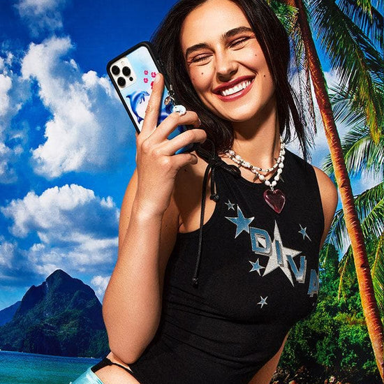Straight out of a Hawaiian island scene on the beach, two playful dolphins are the center of our Dolphin Love iPhone case. Bright pink florals dance across a soft rainbow with our dolphins on this baby blue case. Shop this limited edition case fit for a Malibu barbie.