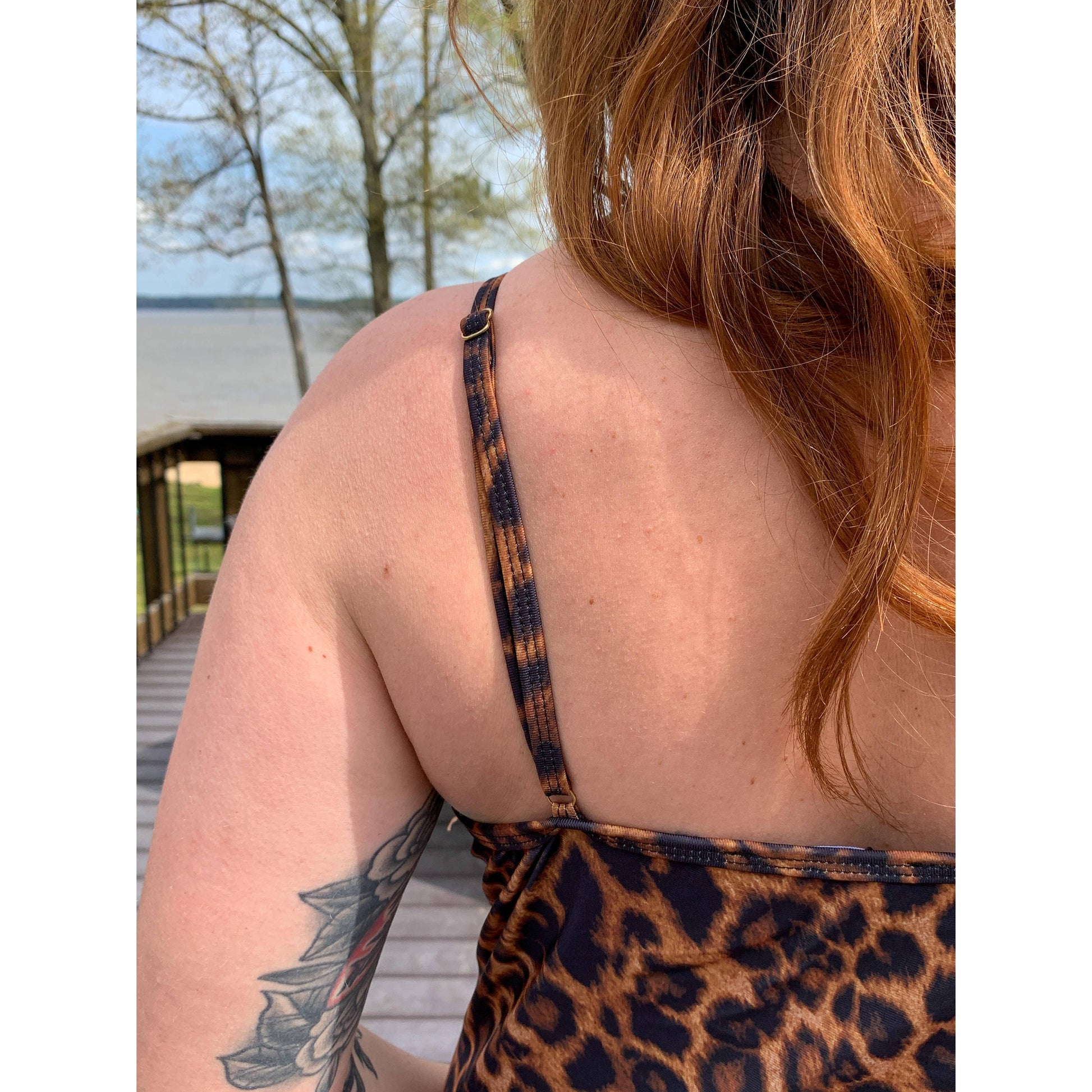 With fringe flowing from the broad v-neckline, adjustable straps, modest cut, and lightly padded cups, in 2 fun prints and 2 beautiful and flattering solid shades!