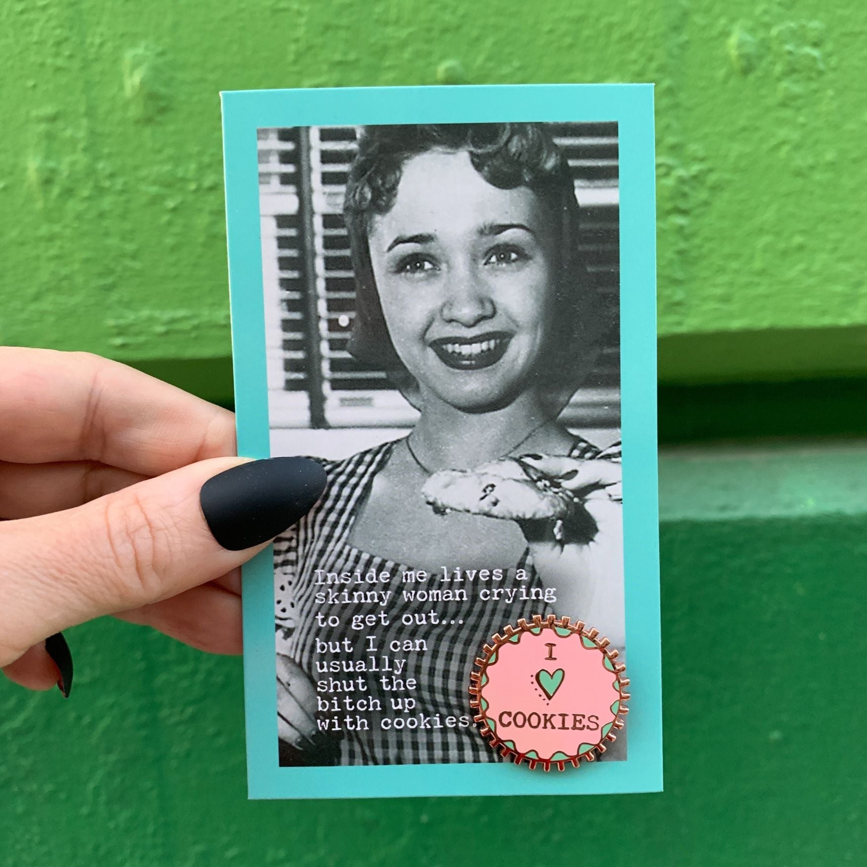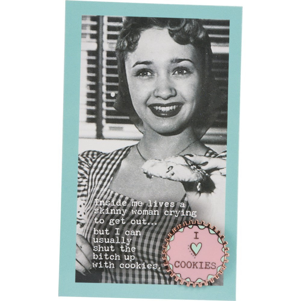 Comes packaged on a thoughtfully-coordinated vintage photograph card reading "Inside Me Lives A Skinny Woman Crying To Get Out... But I Can Usually Shut The Bitch Up With Cookies."