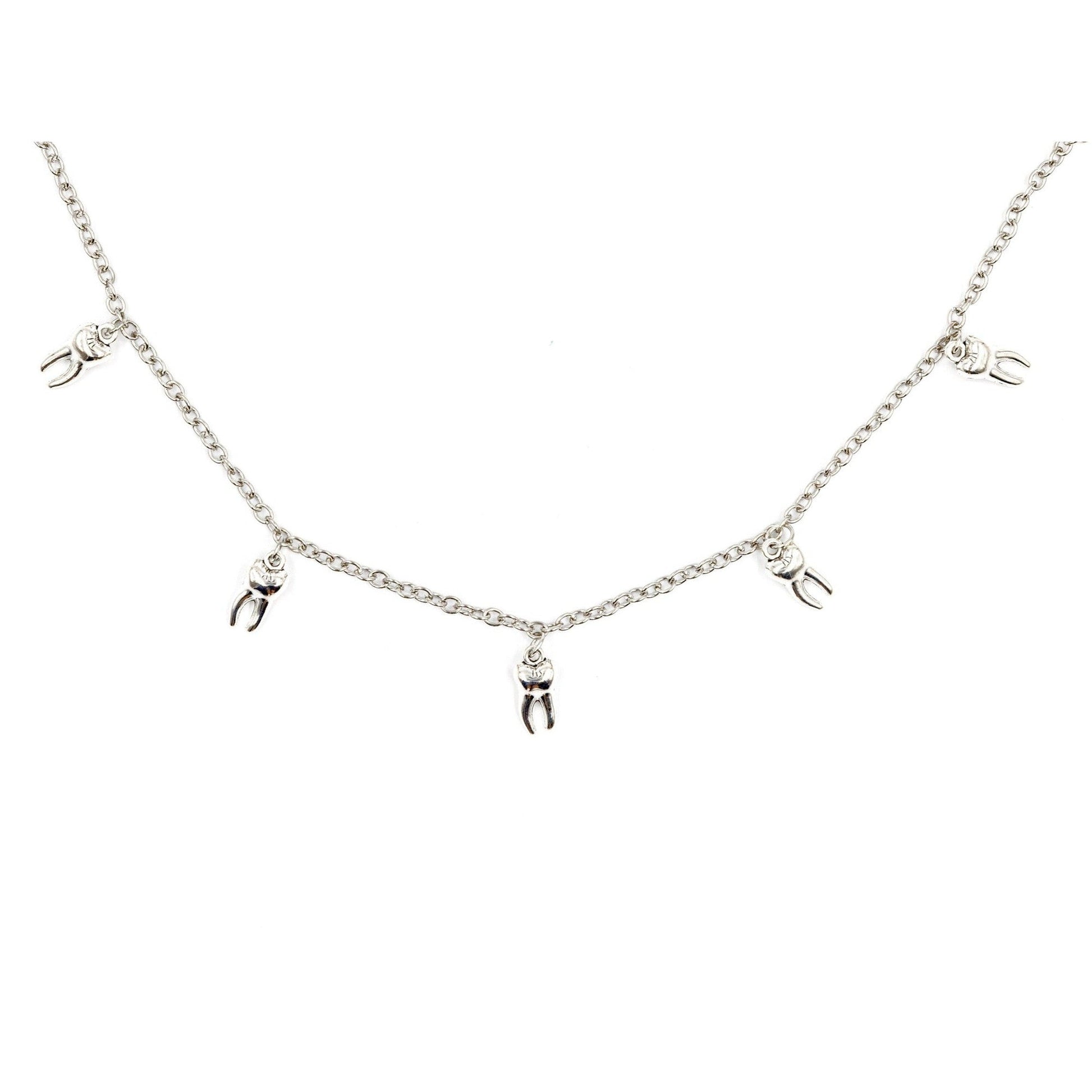 Seven man-repelling tooth charms decorate this 19-inch silver chain ending in a lobster clasp.