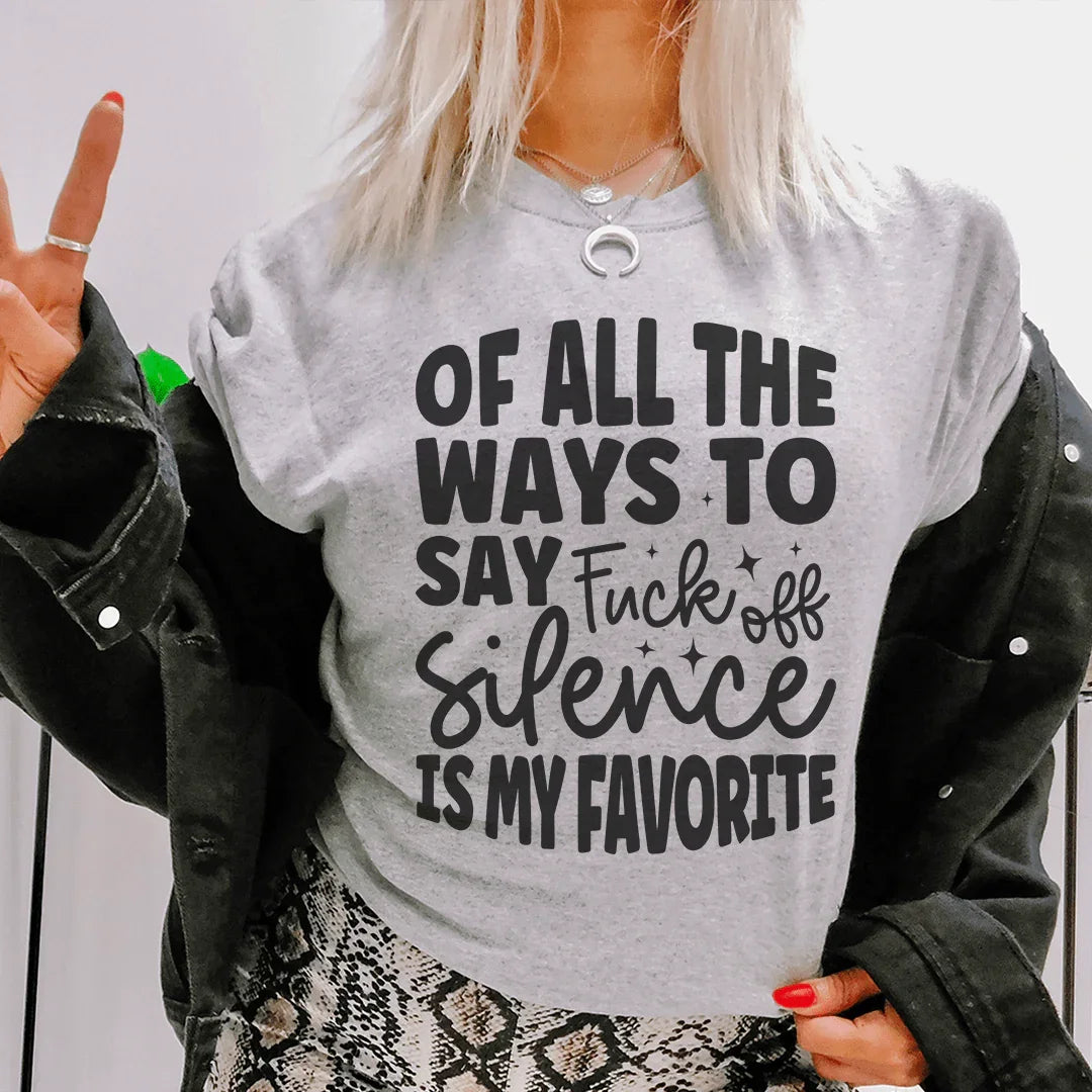 Welcome the "Of All The Ways To Say Fuck Off, Silence Is My Favorite" Tee. Crafted from sumptuously soft cotton that feels like a calming whisper against your skin, this shirt speaks volumes about your pacific nature.