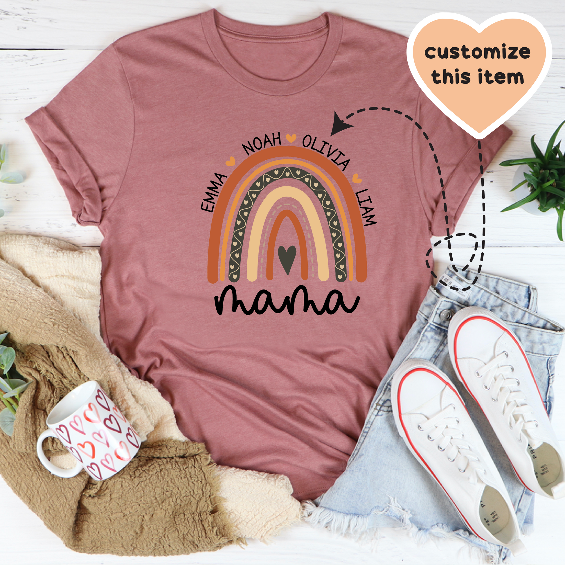 Add a touch of charm to your wardrobe with the Personalized Mama Boho Rainbow Tee. Featuring a whimsical rainbow design and the word "Mama," this tee can be customized with your kids' names, making it a sweet and stylish way to showcase your love.