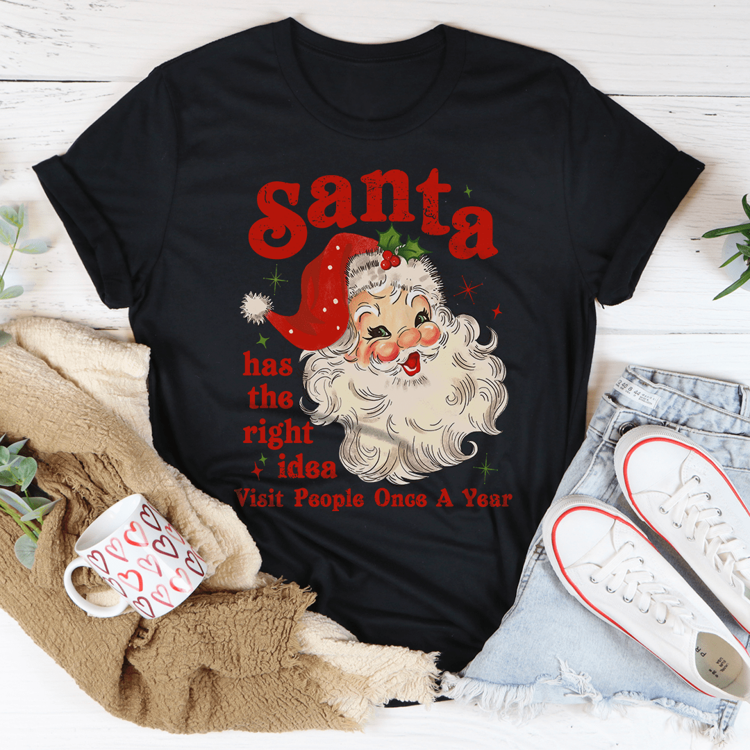Embrace the joy of minimal social obligations with our "Santa Has The Right Idea Visit People Once A Year" t-shirt. This witty tee is perfect for those who appreciate Santa's efficient approach to socializing, making it a great conversation starter at holiday parties or while lounging at home during the festive season.
