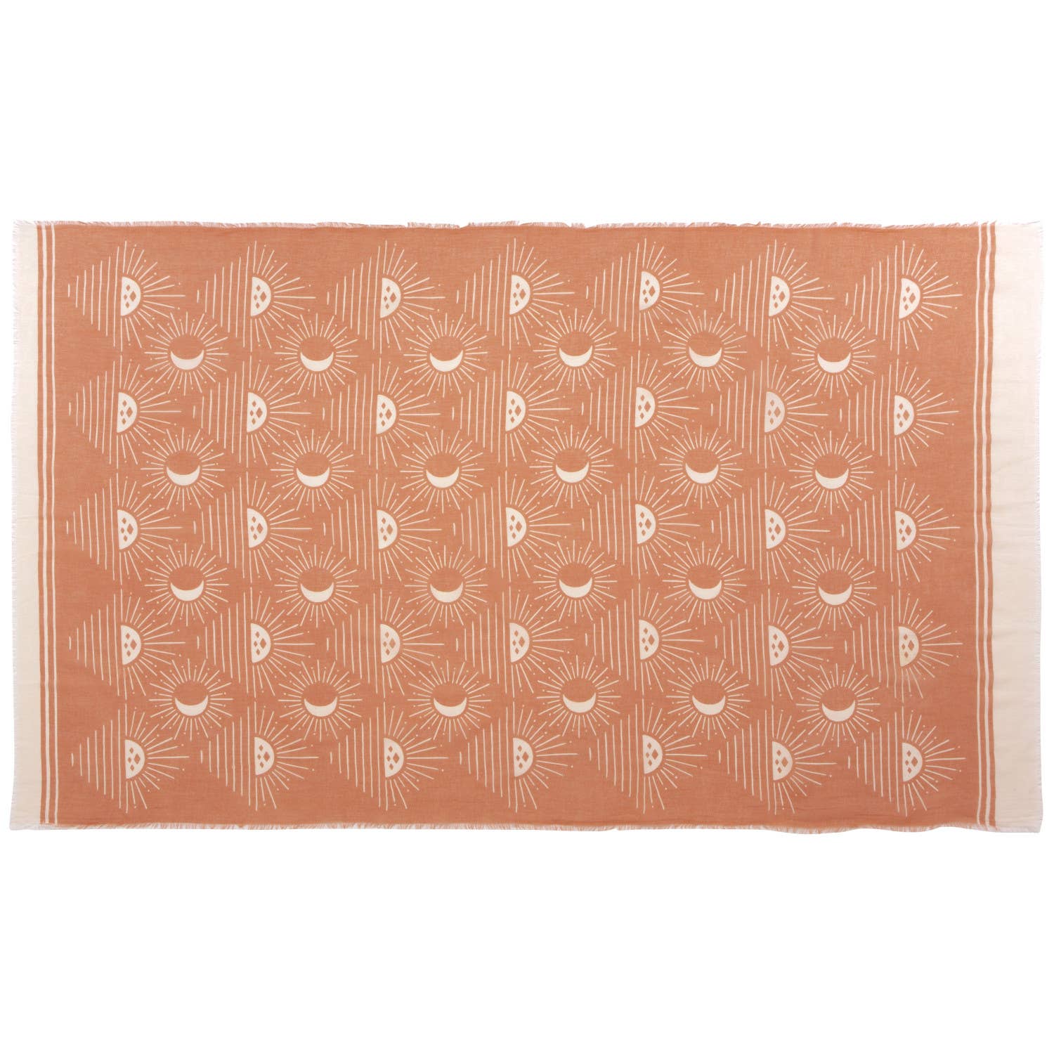 The warm ochre palette and sun-inspired imagery of this distinctive accessory complement both work and casual attire.