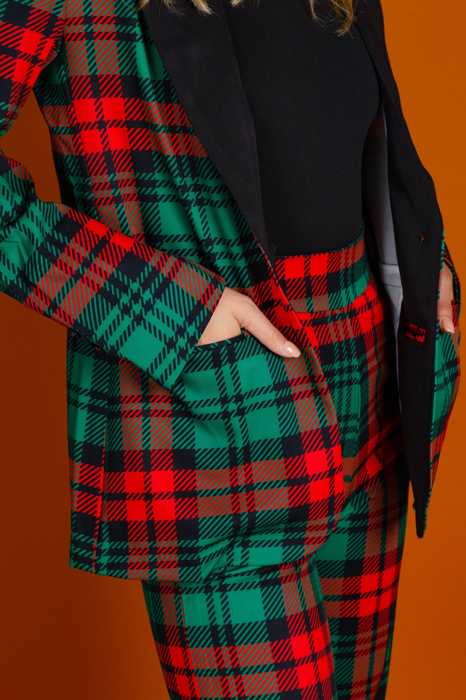 As you stare longingly at this ladies tartan print suit blazer, you might remember playing with Lincoln Logs as a kid, building nice little homes for your pretend tiny family. Well fast forward to now, where things aren't as Lincoln Log promised. You live in a studio apartment in the bad part of town. You're a few decades or a few divorces away from even considering buying a house. That's why you don't play with toys anymore (outside the bedroom). In fact, you've got somewhat of a vendetta against homes too. Luckily, in this Xmas pattern suit it's not hard to be a homewrecker.