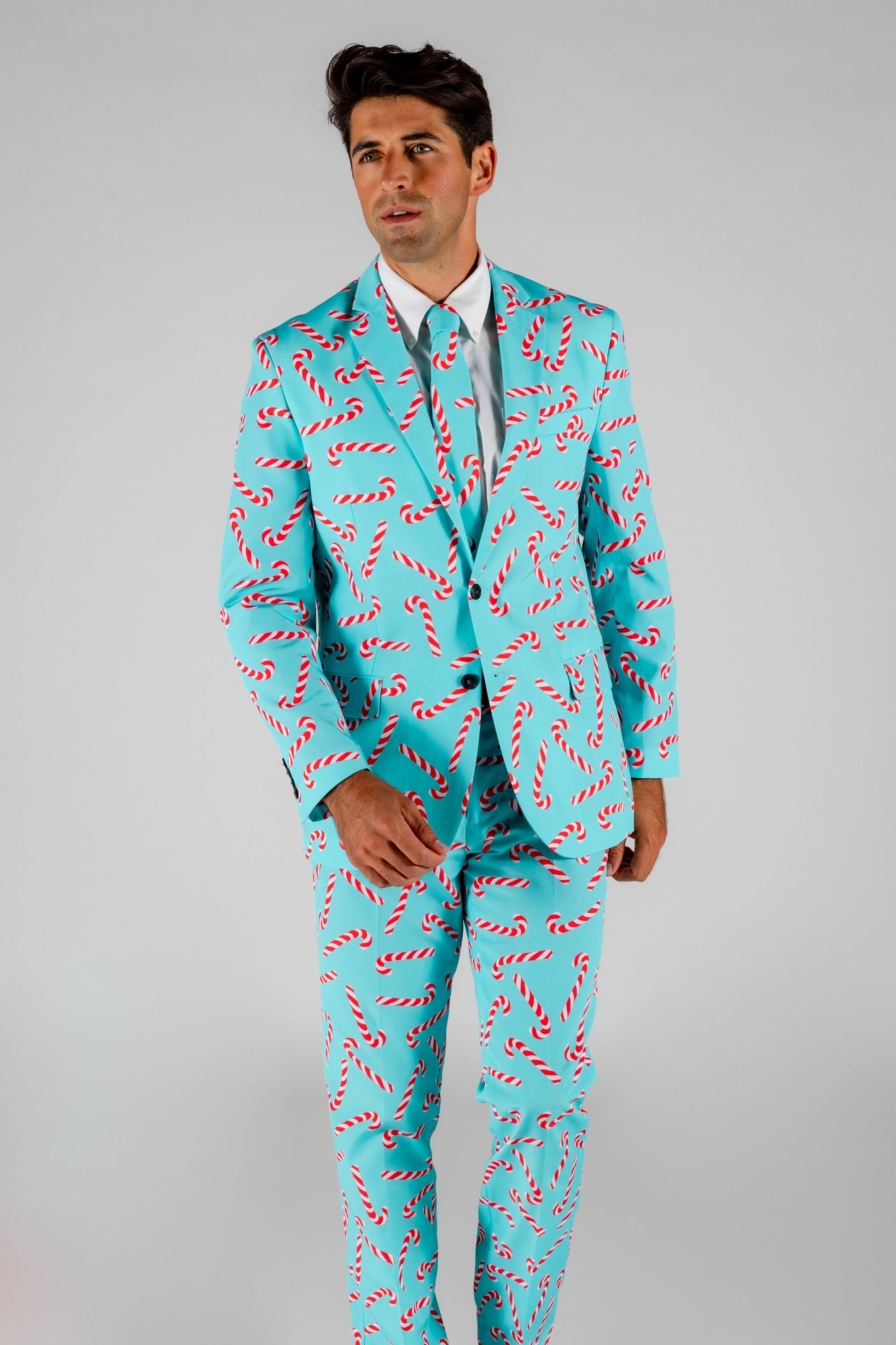 Strut your motha frostin' stuff. This candy cane print Christmas suit is how you're going to assert your dominance this winter. Everyone's got a sweet tooth during the holidays and look who just walked in packing serious candy cane heat. In this light blue Xmas pattern jacket, you'll be the belle of every ball. The only downside of this suit is how often you'll be asked to take it off.
