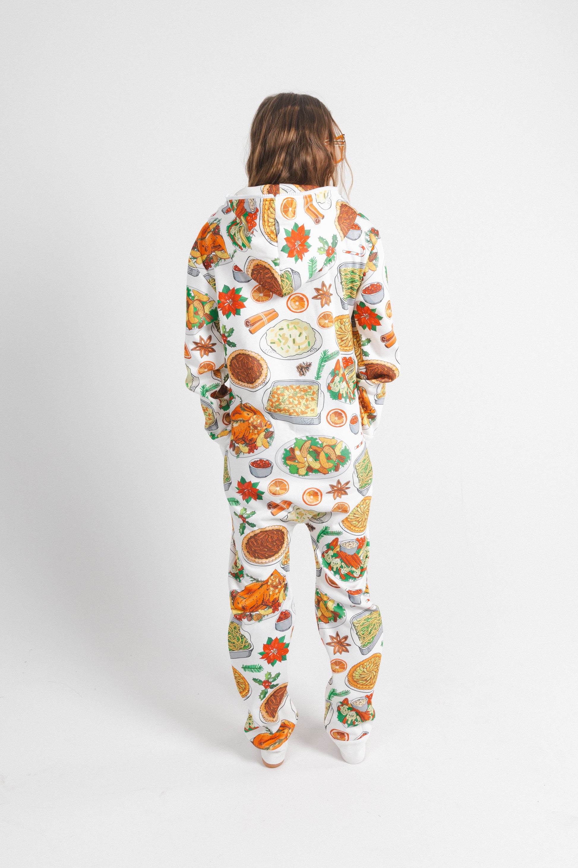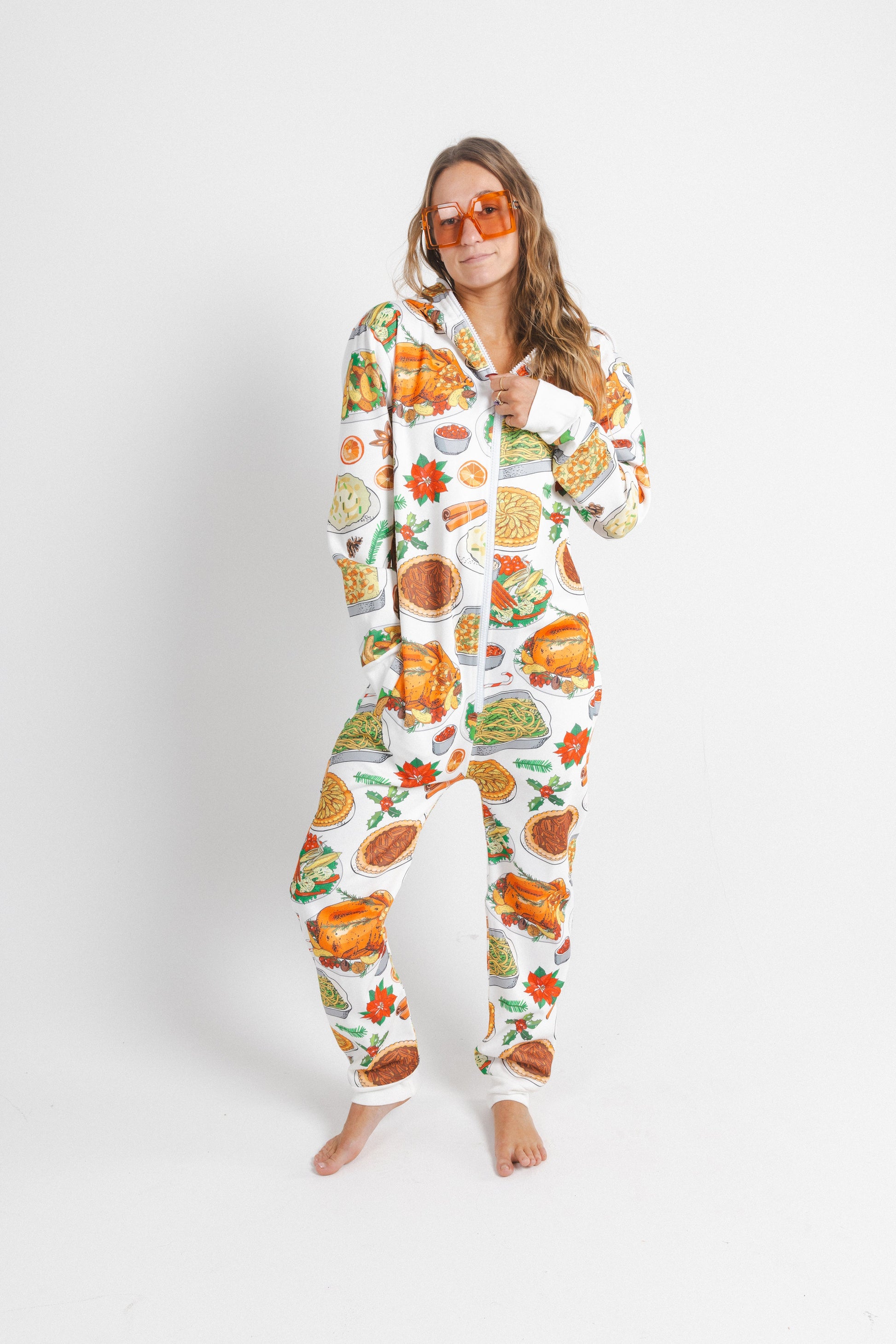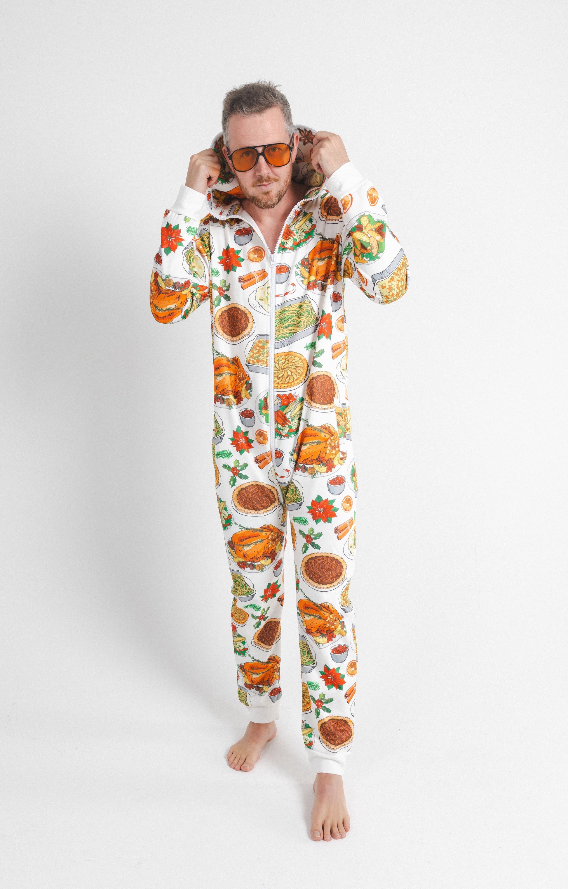 One Thanksgiving, our family meal was marred by a bizarre chain of events that I will recount to you now. My Uncle Bob was never a thin man, but due to an affinity for my grandma's cooking, the button on his pants was hanging on for dear life particularly hard that day. He was seated by the window so he could experience his unpleasant overconsumption symptoms without sweating on anybody's dinner, and I remember seeing him talking to himself without blinking. About halfway through the meal, his pants button suddenly popped and went flying toward the other table, straight at Uncle Gaither's glass eye. Uncle Gaither yelped, the glass eye popped out, and it fell right into the cranberry sauce, which splashed allllllll over my mom's pristine white vintage lace tablecloth. Uncle Bob got up to help, but his idea of "helping" was attempting to rip the tablecloth out from underneath the feast like a cartoon magician. Food and a single eyeball went soaring and dinner was ruined. Eventually, we found Uncle Gaither's eye in the rubble, but it's been a little pink ever since that day. I can't help but think that if Uncle Bob had just been wearing these Thanksgiving Pajamaralls®, that catastrophe would have been averted, and he could have just slept it off, preferably in another room.