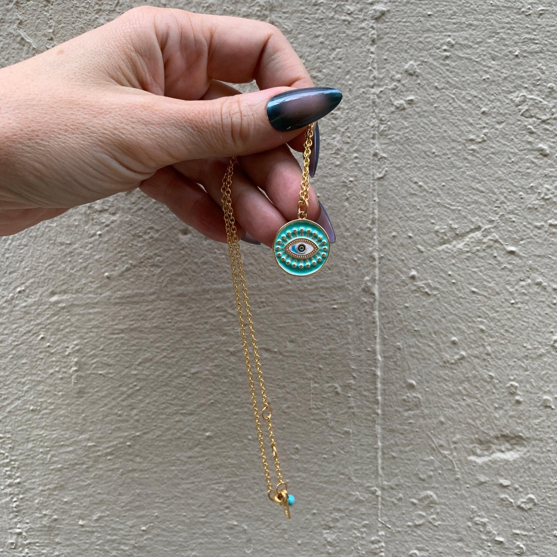 Turquoise enamel brass eye pendant keeps a close watch on things.